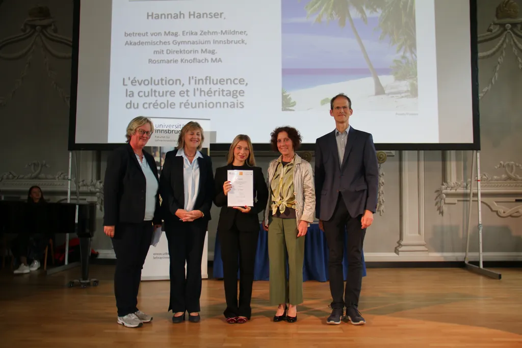 Beeindruckend ist auch das hohe Sprachniveau im Französischen, das die Arbeit auszeichnet und die beiden Gutachterinnen sehr beeindruckt hat. Meine Kollegin Verena Thaler und ich sowie die gesamte Jury gratulieren Dir, aber natürlich auch deiner Betreuungslehrerin, herzlich zum 2. Preis im Bereich Lebende Fremdsprachen.